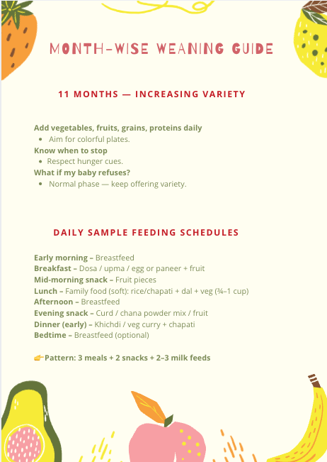 Dairy (curd, paneer)These should be homemade and hygienic, with increasing texture over time.